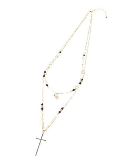 カジュアルスタイルの味付けに欠かせない本格ネックレス。フロントにクロスモチーフをあしらったロザリオは2連になったボリューム感のあるデザインがポイント。2連目のトップにはマリア像を刻印したミニプレートを配し格式高い雰囲気に仕上げています。カラービーズやクリアストーンなどキラメキ感をプラスし華やかな印象に。シンプルなスタイリングのアクセントに最適です。