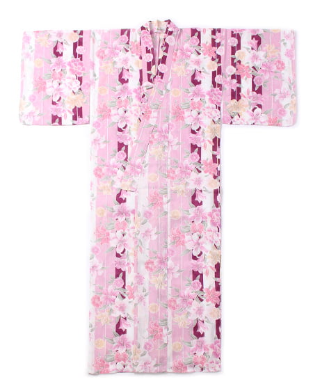 夏のイベントに欠かせないこだわりの浴衣は華やかな表情を演出してくれる一着。爽やかなストライプ柄にユリをあしらったデザインはフェミニンかつモダンな印象の着こなしに仕上がります。浴衣とコーディネートされたキュートな下駄と作り帯がセットになった嬉しいアイテム。帯はリボンを刺す簡単仕様で着つけもラクチンです。