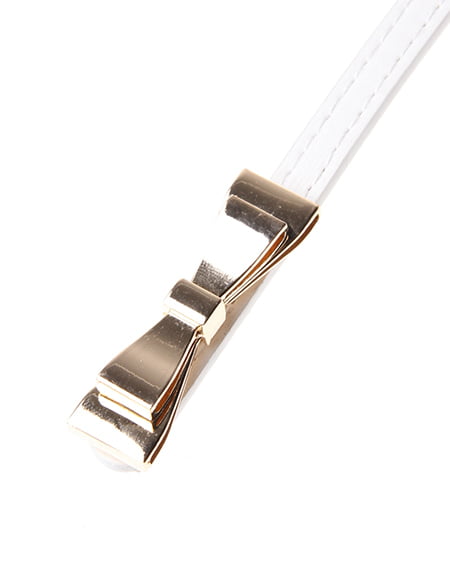 細身のベルトで着こなしのアクセントに。フロントにゴールドのリボンモチーフをあしらったベルトはキュートなデザインと主張しずぎないさりげないサイズ感が魅力。シンプルなシルエットで使いやすくどんなスタイルにもぴったり決まります。6段階調節ができ幅広いサイズをしっかりカバー。ワンタッチ式の取り外しやすい仕様も魅力です。