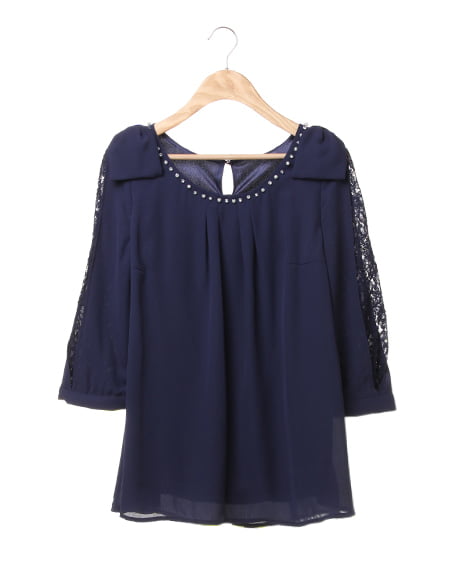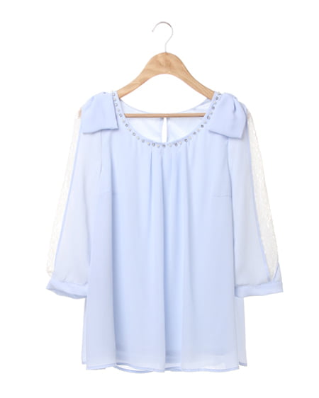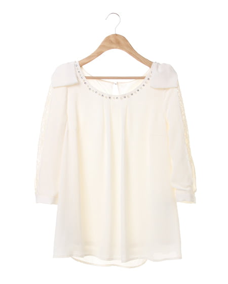 フェミニンルックに合わせたいこだわりの一着。薄手のシフォン素材を用いた季節感のあるブラウスはショルダー部分にあしらったリボンがポイント。衿元のビジューと合わせて顔周りを華やかに見せてくれます。袖は透け感のあるレースとのレイヤードデザインで女性らしさをプラス。レディーライクにまとめれば好感度満点のスタイリングが完成します。