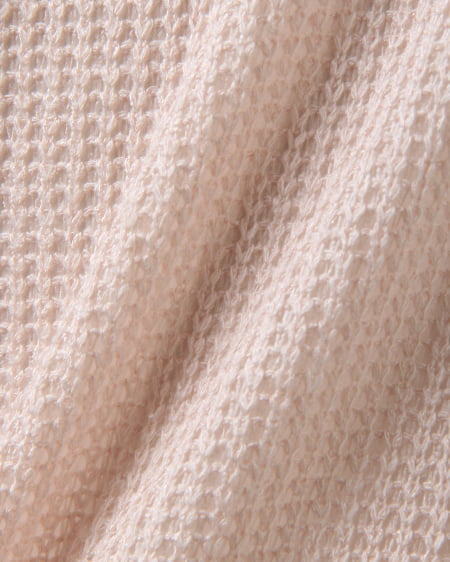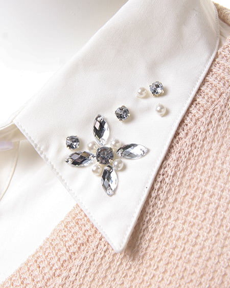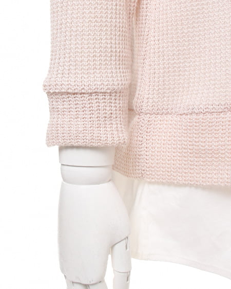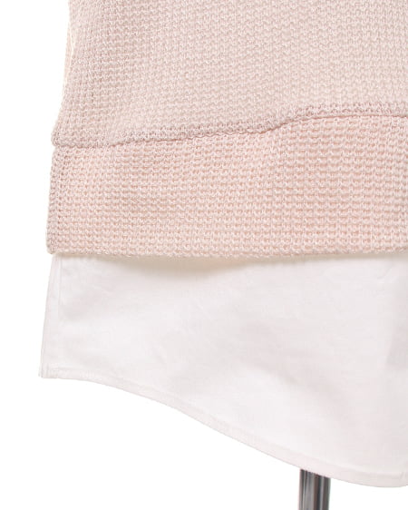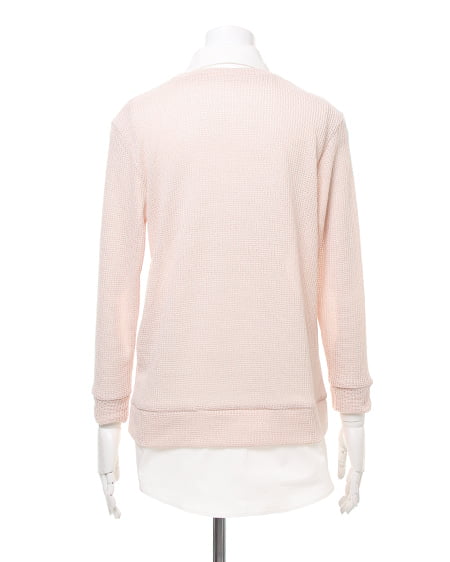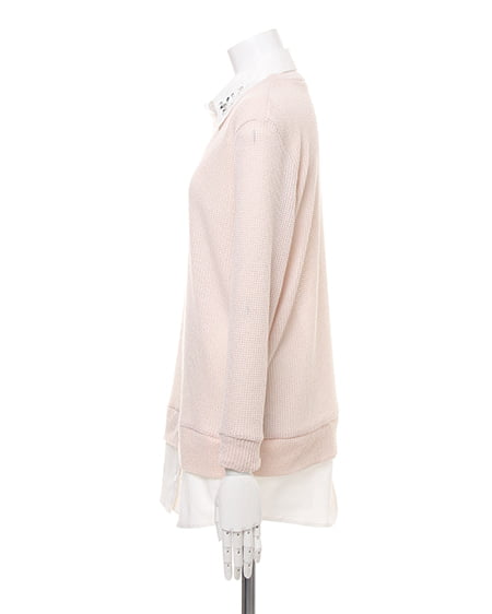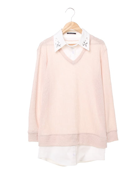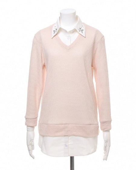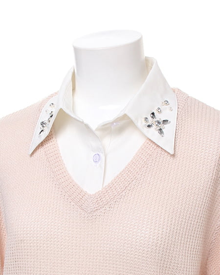 レイヤード風デザインでスタイリッシュな着こなしに。ざっくりとした畦編みニットにシャツディテールをプラスしたデザイン性の高いトップス。衿にはビジューをあしらい華やかな表情に仕上げました。肌触りのいいニットはライトな素材感で透け感もありカジュアルに着られます。ゆったりボーイフレンドデニムでルーズに合わせるのが気分。