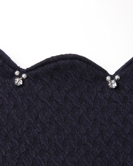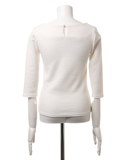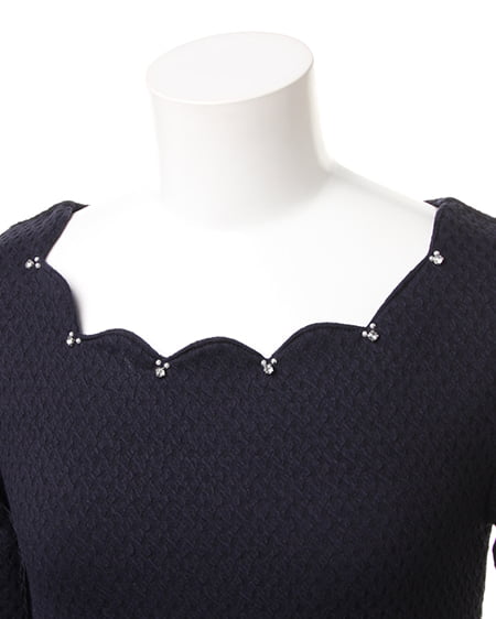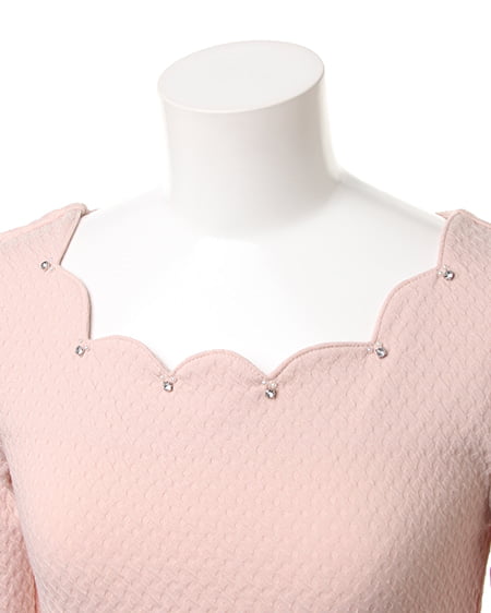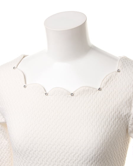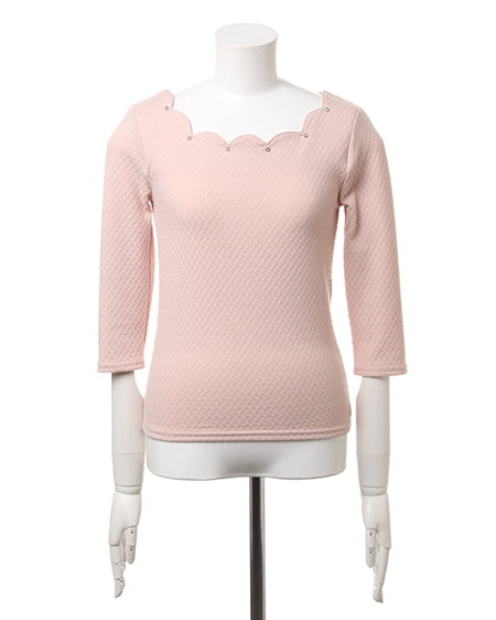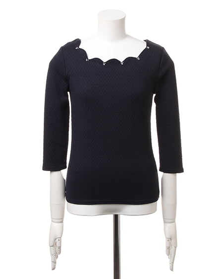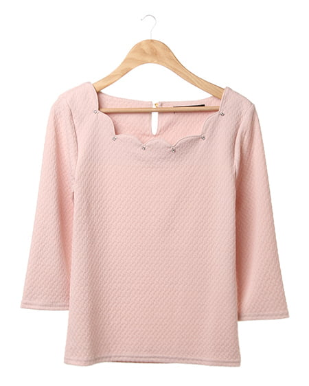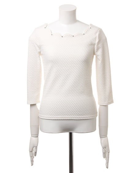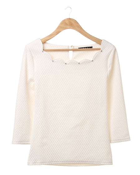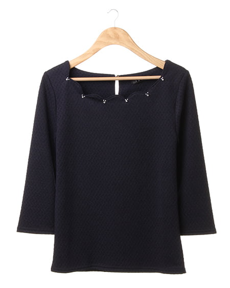 キュートなデザインのこだわりトップス。衿元をスカラップデザインに仕上げたブラウスはフェミニンコーデに欠かせない一着。スカラップ部分にはビジューをあしらい華やかな表情をプラスしました。シンプルなシルエットは着こなしやすく合わせやすさも抜群。伸縮性もありソフトな肌触りで快適な着心地です。