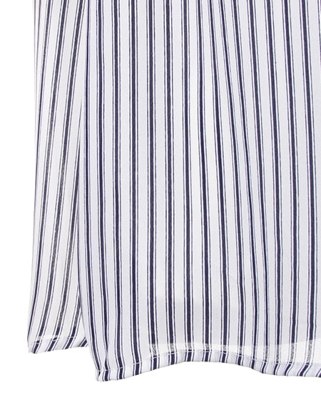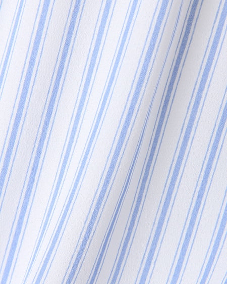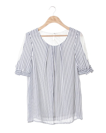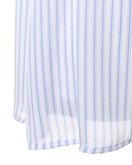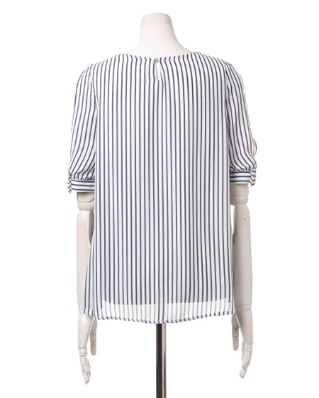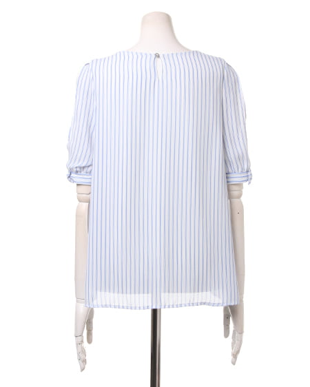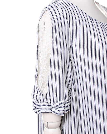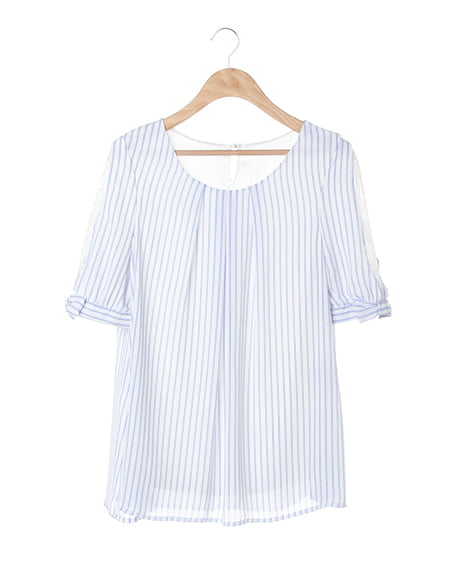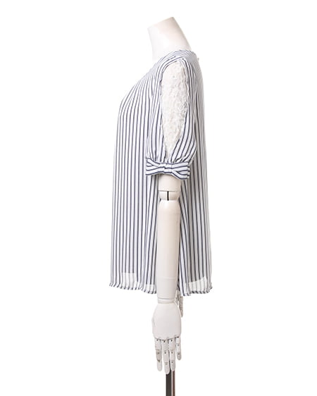 クール×フェミニンにまとめた大人ライクな一着。涼しげなシアー素材が季節感のあるブラウスはクールなストライプ柄でより爽やかな印象に。繊細なレース素材との組み合わせで女性らしさをプラスし、袖口にはキュートなリボンをあしらいました。ふんわりしたシルエットは着こなしやすくカジュアルダウンさせてもおしゃれに仕上がります。