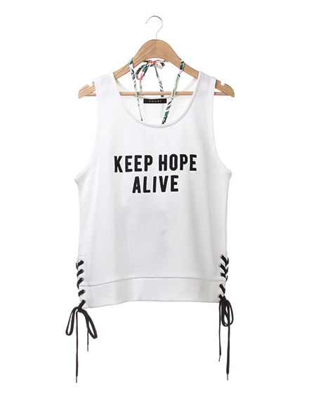 両サイドにレースアップデザインを施したタンクトップとブラトップのセットアイテム。すっきりとしたアームホールから覗くホルターネックのブラトップは、今季注目のボタニカル柄でトレンド感を取り入れて。お好みでホルターネックの紐は取り外しも可能です。ノースリーブのレタードトップスは、薄手のスウェット素材で着心地も良くスタイリッシュなレイヤードを演出してくれます。それぞれお手持ちのアイテムと合わせてコーデできるのも嬉しいポイント。