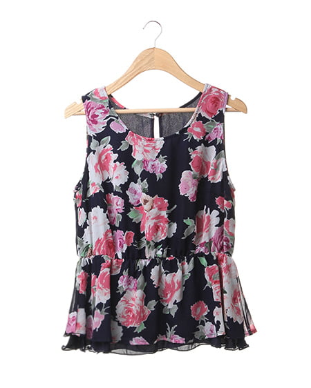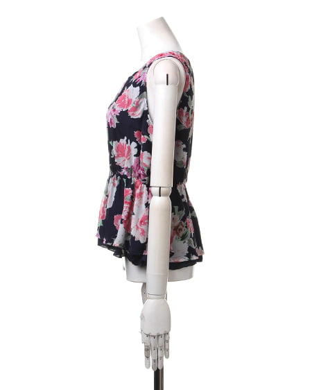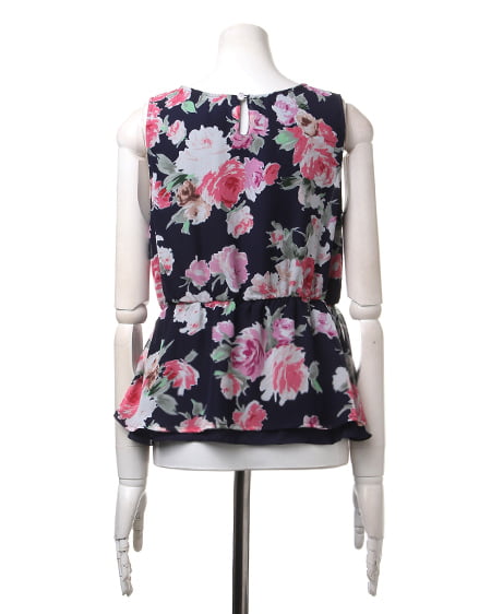 薄手のベース生地に透け感のあるシフォンを重ねたフェミニンな1枚。ノースリーブデザインでトップをコンパクトにまとめ、高めに入れたウエストラインから広がるフレアのデザインで女性らしいシルエットに。裾部分は長さを変えて、レイヤードしているように見えるのもポイント。存在感のあるアイテムなので、ボトムスはすっきりまとめるのがオススメ。