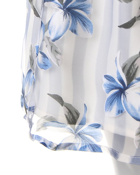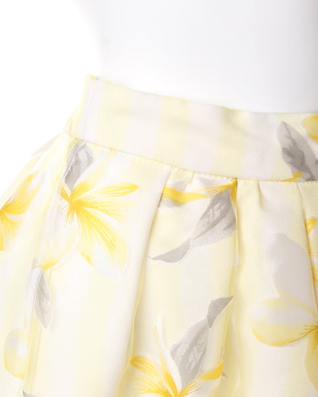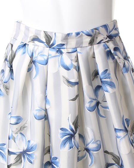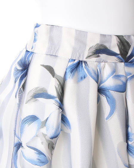 爽やかスタイルに欠かせない華やぎスカート。ボリューム感のあるフレアスカートはストライプに花柄をあしらった季節感のある柄で涼しげな印象に。透け感のある異素材とのレイヤーでよりライトなスタイリングに仕上がります。ウエストゴム仕様で着心地も抜群。女性らしいトップスと合わせれば愛されコーデが完成します。