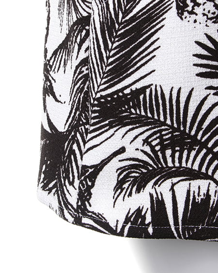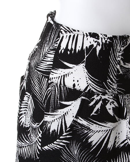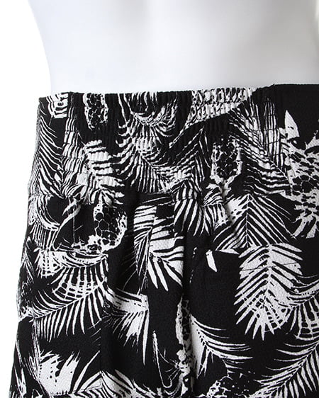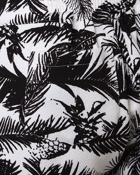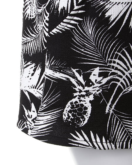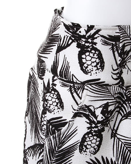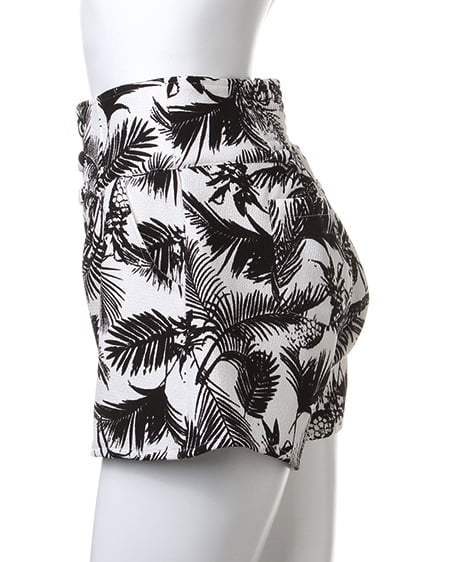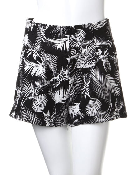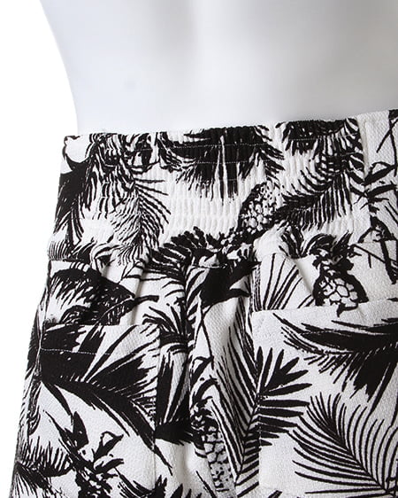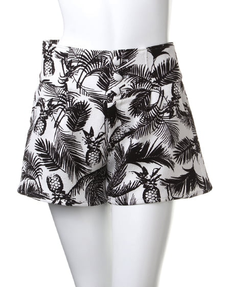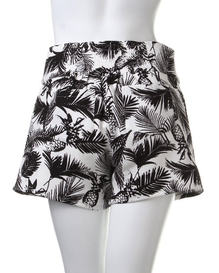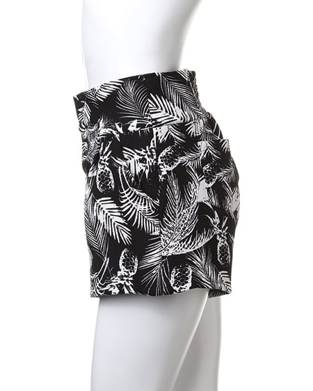 リゾート感満点これからの季節大活躍のショートパンツ。パイナップル柄がインパクト大のクールなショートパンツ。ハイウエストシルエットのショートパンツは着回し力抜群な使い勝手の良い一着。深めの股上はトップスインもしやすく腰高効果が期待できます。さらっとした素材の裏地付きでこれからの季節にも快適な着心地です。