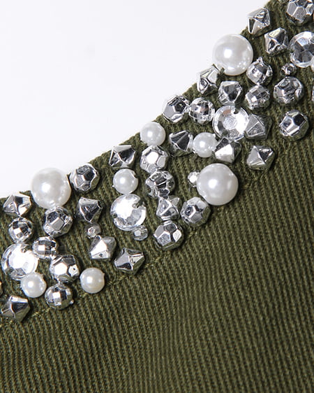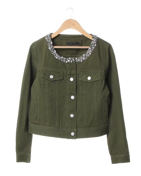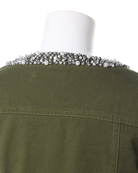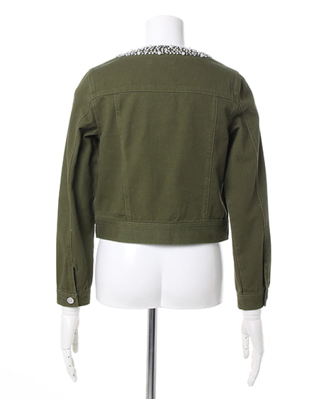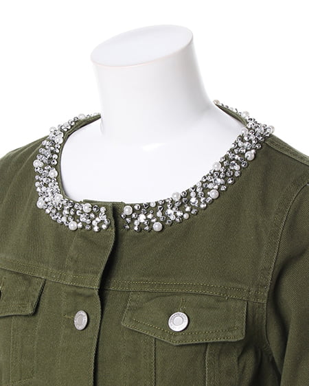 大人カジュアルに合わせたいこだわりアウター。衿元にビジューをあしらったデコラティブなジージャンは春先に欠かせないアイテム。すっきりとしたノーカラー仕様にアクセントの装飾が女性らしさをプラスしてくれます。短めの着丈は合わせやすくワンピースやチュニックとも相性抜群です。ポケット付きなところも見逃せない嬉しいポイントです。