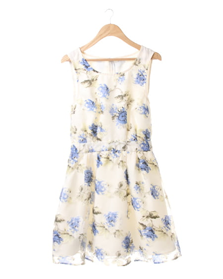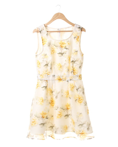 花柄をあしらった女性らしい一着。ふんわりしたフィット&フレアシルエットのワンピースはこだわり感の高いアイテム。透け感のあるオーガンジー素材に花柄をプリントし立体感のある表情に仕上げています。バックウエストにはゴム入りで着心地も抜群。カーデやジャケットとのレイヤードにもオススメです。
