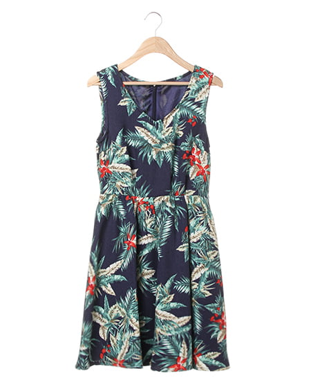 バカンス気分に最適なサマーな一着。大胆なリーフ柄が目を引くワンピースはすっきりとしたノースリーブシルエットの合わせやすいデザインが魅力。ウエスト切替の女性らしいフィット&フレアシルエットはメリハリのある着こなしを演出でき軽やかさをプラスできます。ソフトな素材は肌馴染みも良く着心地も抜群です。