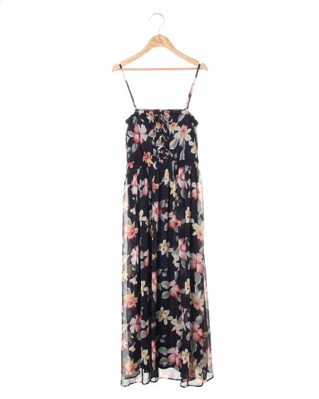 爽やかなスタイリングに仕上がるキュートな一着。全体にハイビスカス柄をあしらった夏らしいワンピースは足元まである長めのマキシ丈で大人な着こなしに。すっきりとしたベアタイプでタウンユースにはもちろん、リゾートやバカンススタイルにもオススメです。