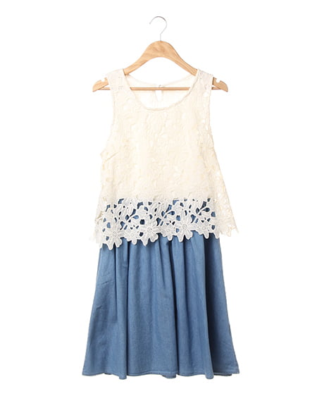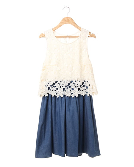 フェミニンなレースとカジュアルなデニムを組み合わせたドッキングワンピ。女の子らしいモチーフレースを用いたトップ部分はすっきりとしたノースリーブシルエットで季節感のある着こなしに。スカート部分はセパレート風につなぎ合わせることでスタイリングにメリハリをプラスしました。スカートは軽やかなフレアで爽やかな印象に。一枚でさらっと着たいアイテムです。