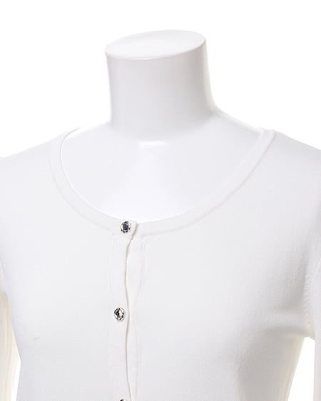 コンパクトデザインの定番アイテム。万能に使えるシンプルデザインのカーディガンはワードローブに欠かせない一着。薄手のさらっとした生地は肌触りもよく着心地も抜群です。アクセントとしてボタンはきらめき感のあるビジューボタンを用いて女性らしさをプラスしました。淡いカラーを取り揃えた豊富なカラバリも魅力です。