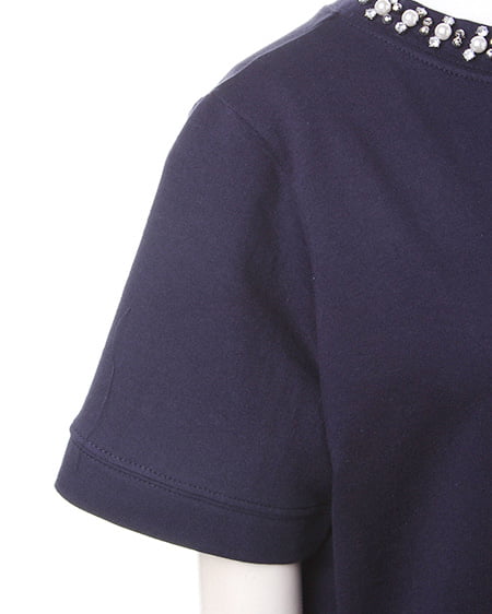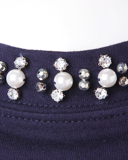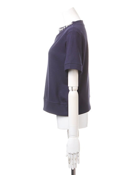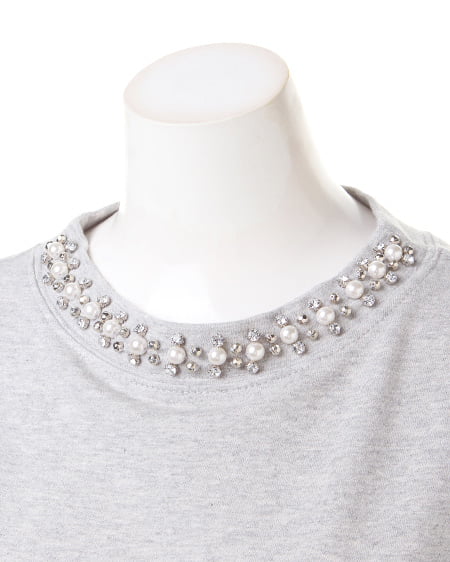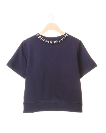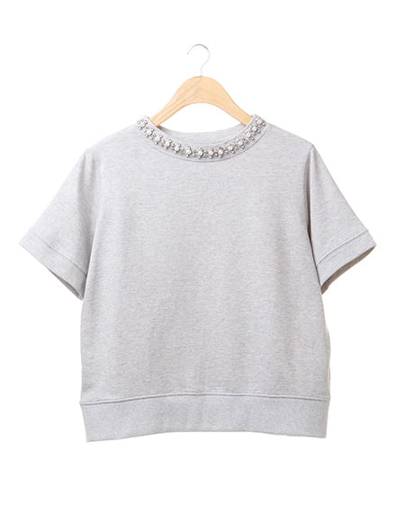 ワイドスリーブでゆったりとしたシルエットが特徴的なビジュー装飾付きトップス。今年トレンドのクルーネックの首元にビジュー装飾をあしらい、華やかな印象に仕上げてくれます。ゆったりとしたシルエットが大人フェミニンなスタイリングの主役に。やわらかな裏毛素材で着心地抜群なのも嬉しいポイントです。程よい着丈でトップスインもしやすく、人気のミディ丈のスカートに合わせたりデニムとのミックススタイルもオススメです。