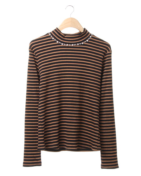 ストライプ模様のワイドリブが心地よくフィットするトップス。ハイネックで伸縮性のある素材が優しく肌にフィットする長袖トップスです。袖がやや細めで外気が入りにくく、これからのシーズンにオススメ。フロントネックにパール装飾をあしらい輝きをプラスしました。コンパクトカーデにフレアスカート合わせのフェミニンコーデやボトムINスタイルにぴったりなアイテムです。
