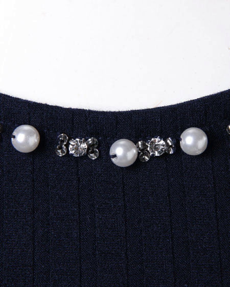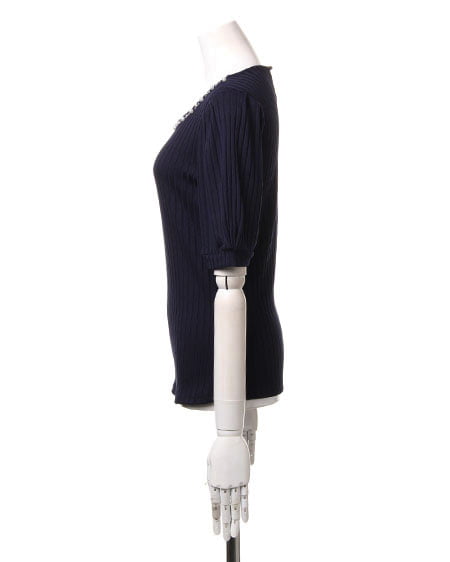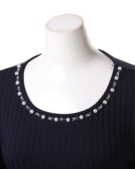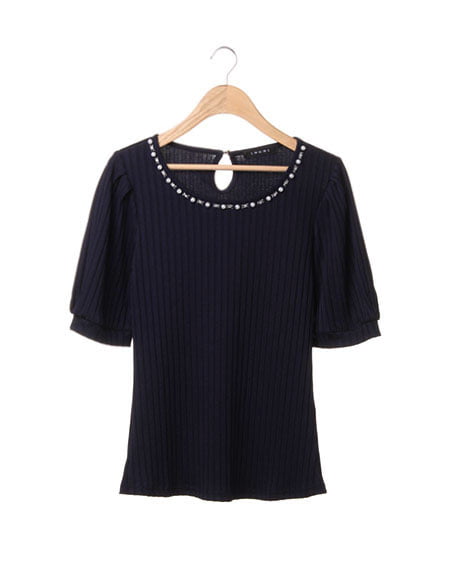 人気のワイドリブ模様のタック袖トップス。伸縮性のある素材が優しく肌にフィットするトップスは、少し丸みのあるタックを入れた半袖デザインが女性らしいシルエットのアイテム。フロントネックにパール装飾をあしらい顔まわりを明るくしてくれます。バックのボタン付き涙あきデザインで女性らしさもアップ。フレアスカートやデニムと好相性のシンプルで万能なトップスです。