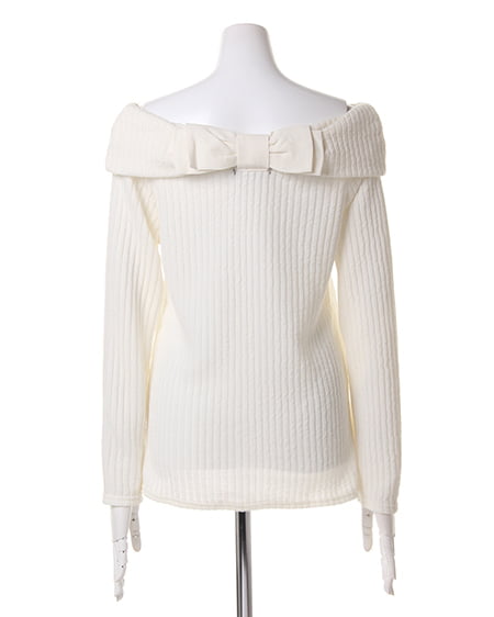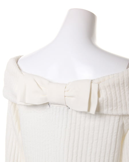 キュートなバックリボンがポイントのオフショルトップス。凹凸のある個性的な生地を使用したリブトップスです。ヘルシーな肌見せが叶うオフショルタイプのトップスは、デコルテラインをキレイに見せてくれます。バックスタイル美人になれる異素材のリボンモチーフで可愛らしさをアップさせて◎。フレアスカートを合わせて甘いスタイリングを楽しみたい日にぴったりなアイテム。