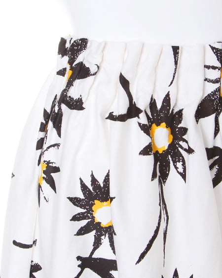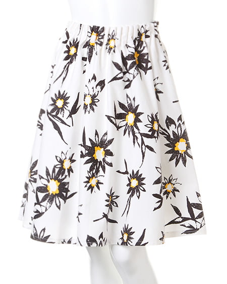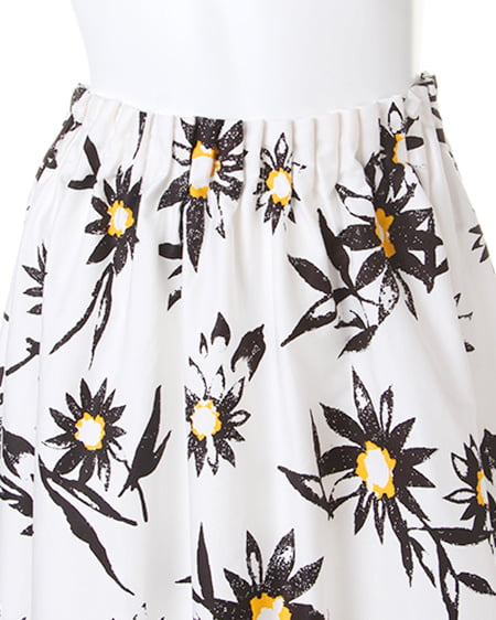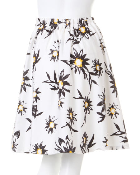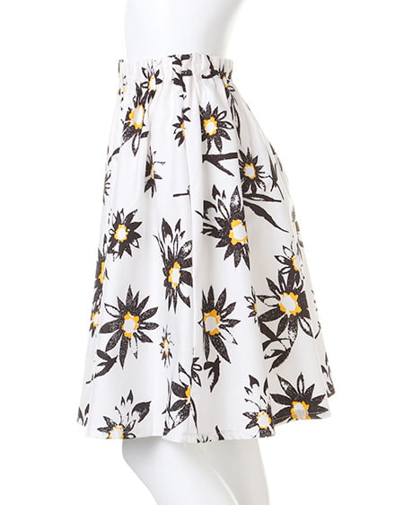 大人キュートなコーディネートが決まる花柄スカート。モノトーンで配色された花柄が上品なイメージと程よいフレアが女性らしい印象を演出、ナチュラルな風合いが魅力のアイテムです。ウエストゴム仕様でリラックスした着心地です。程よい長さが着回しの幅を広げてくれるスカートは、ノースリ―ブトップスやシャツを合わせてシックにまとめるのがオススメです。