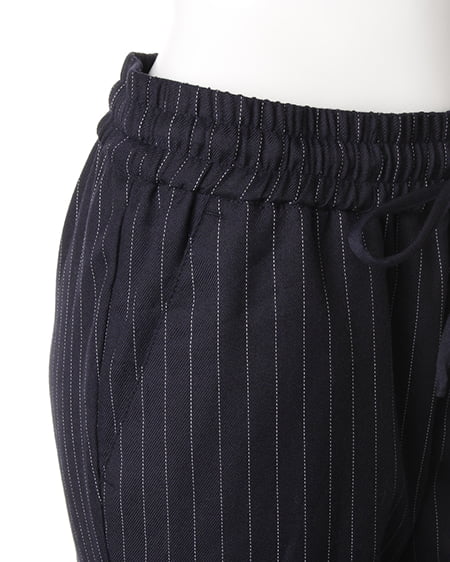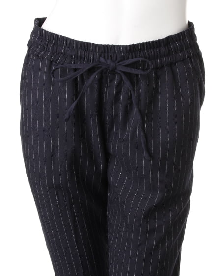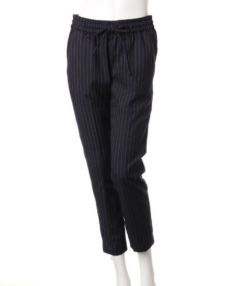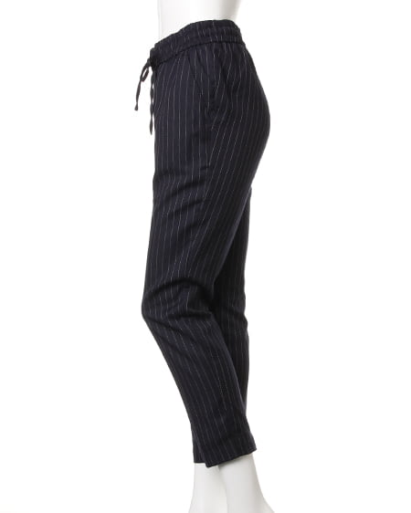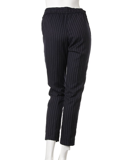 オフィスカジュアルに使えるペンシルストライプ模様のパンツ。やや薄手のソフトな素材を使用したリラクシングな穿き心地に仕上げたパンツです。華奢なストライプ模様とシルエットできちんと感をプラスしました。ウエストゴム仕様で脱ぎ穿きしやすさも抜群です。トップスをシンプルにすることでコーディネートにメリハリをつけて、ロング丈のアウターやカーデを羽織れば今年らしさのあるコーデに仕上がります。