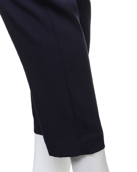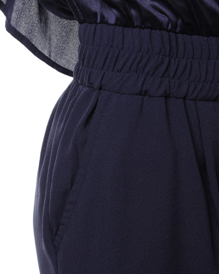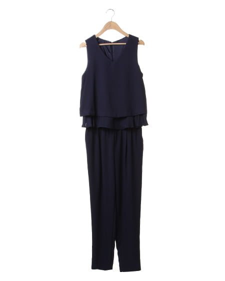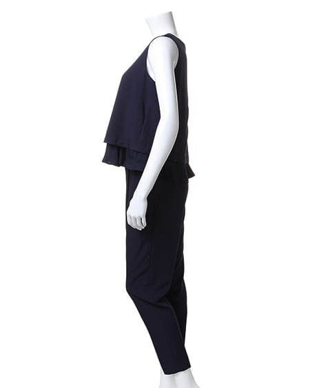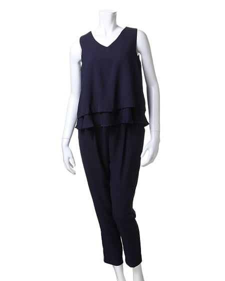スタイリッシュな着こなしを1着で実現できるテーパードコンビネゾン。身頃の切り替え部分を2段フリルにすることで可愛らしさをプラスしました。裾に向かってシェイプされたテーパードシルエットは、シャープな印象を演出。しっかりとしたウエストゴム仕様と生地にストレッチ素材を用いて動きやすさも兼ね備えたアイテムです。インナーにトップスアイテムを合わせれば肌見せオフして着られ、幅広いシーンに合わせて使えるアイテムです。