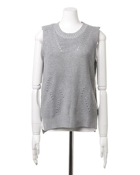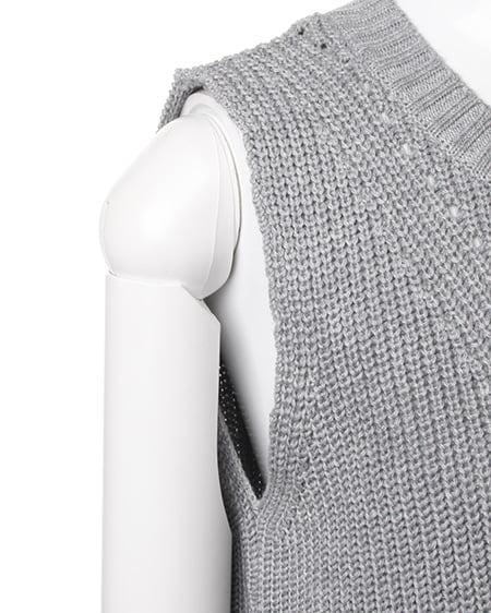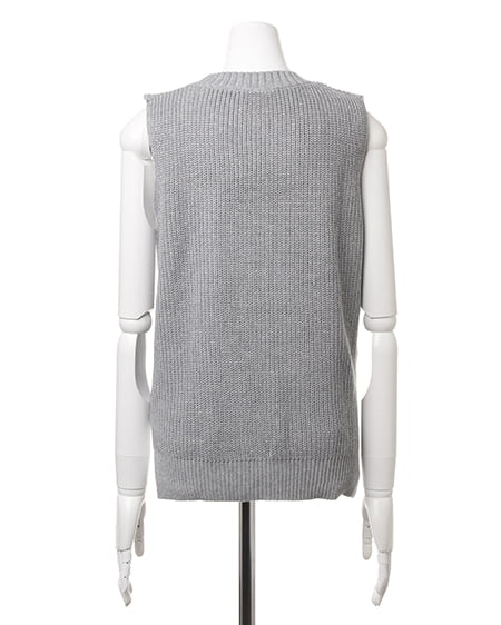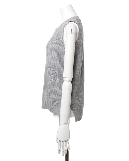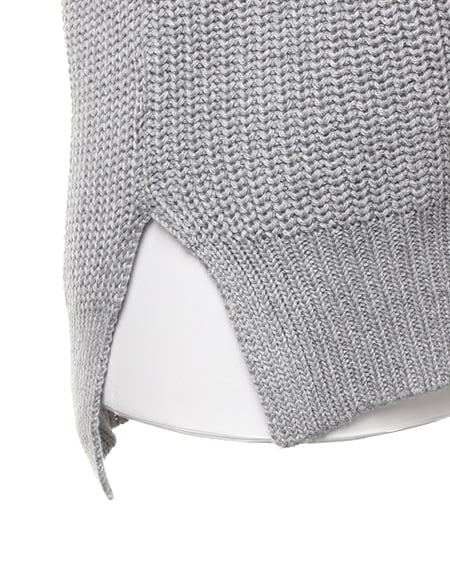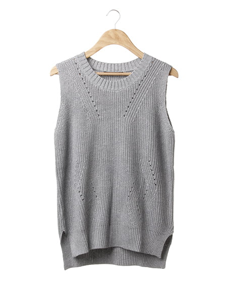 秋冬の新作、厚めニット素材のノースリアイテム。やや長めの丈感のノースリブニットは、Iラインですらりと体型カバーも期待できます。キャミソールやタックトップを中に入れて1枚で着ているような雰囲気にまとめたり、インナーにチェック柄のシャツを重ねて着るのもオススメです。トレンドのガウチョパンツにも合わせやすいデザインです。