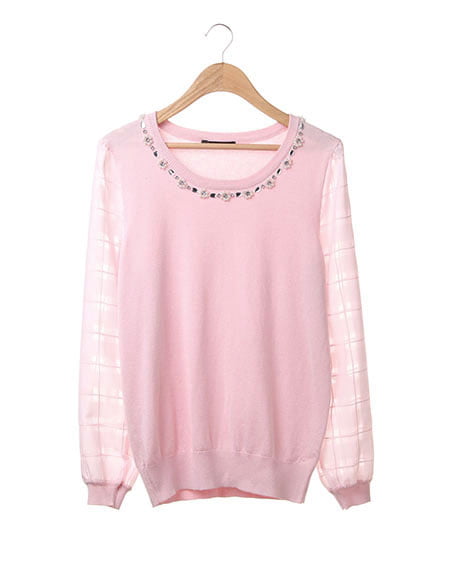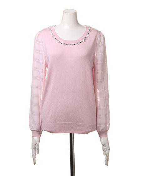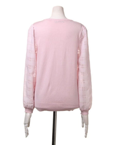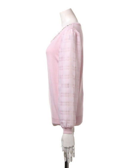 長袖シアーチェック柄ニット。優しい印象を与えてくれる人気のビジュ―付きニットは、袖のチェック模様に少し透け感のある女性らしいデザインです。花柄のフレアスカートに合わせても主張しすぎないエレガントなチェック模様は、上品な印象にまとまります。リブ付きの袖口は、少しまくって腕に付けたアクセを見せるように着るとバランスよく見えオシャレな着こなしが叶います。スカートと合わせて女子力アップのフェミニンな着こなしを楽しんで。