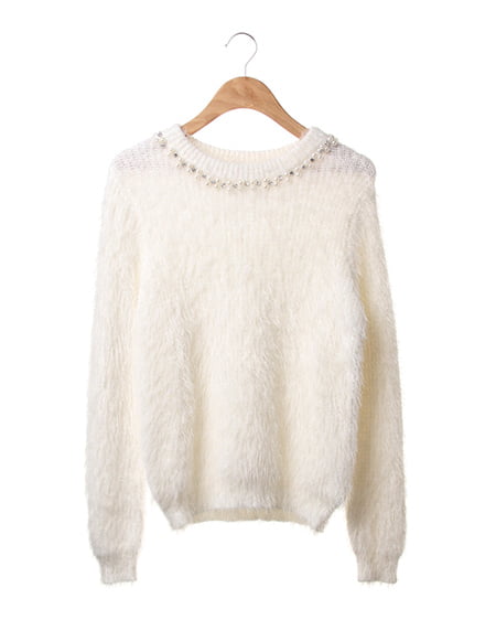 ソフトな肌触りが魅力の滑らかニット。毛足の長いフェザータッチ素材をふんだんに使用したアイテムです。フロントネックにビジュー装飾をあしらい、華やかさをプラスしました。冬に人気のアイシ―カラーも注目。旬の柔らかな素材感とカラーで引き出す女性らしいスタイリングが叶うオシャレ上級者アイテムです。ツイードのスカートや華やかなフレアスカートに合わせたり今から長期間愛用できます。