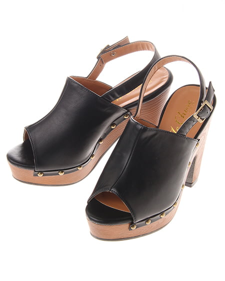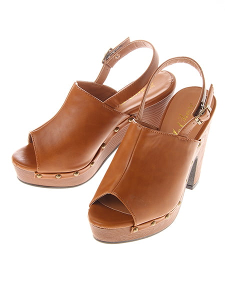 気軽に履けるサボテイストのサンダル。レザータッチのオープントゥシルエットがボヘミアンな雰囲気にまとまる今季オススメのアイテムです。やや高めのヒールが美脚効果抜群。ソール部分もやや厚みがあるので、高低差が軽減されて高さを感じ難く仕上げました。サイドのスタッズが一味クールなポイント。かかとのベルトはボタンで着脱できます。