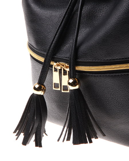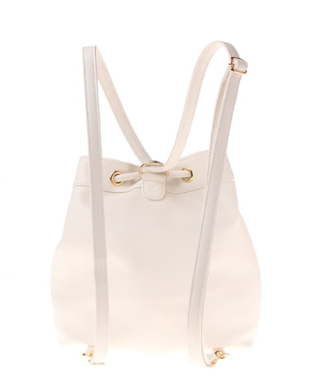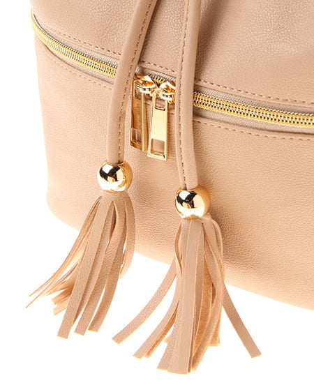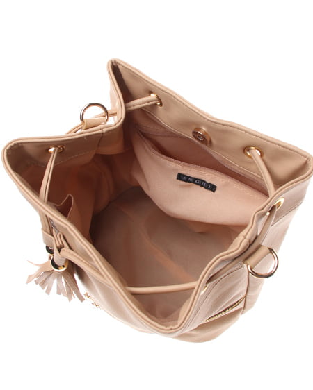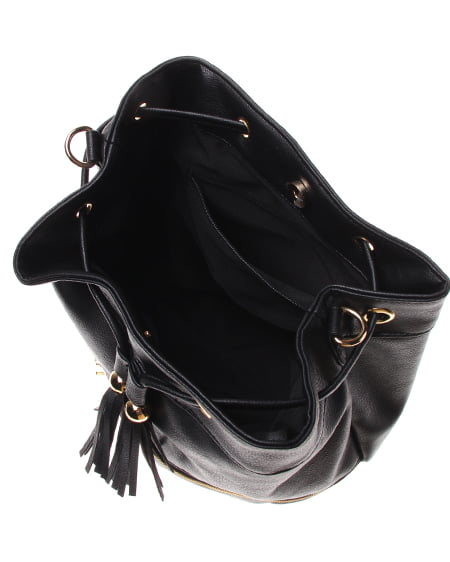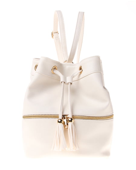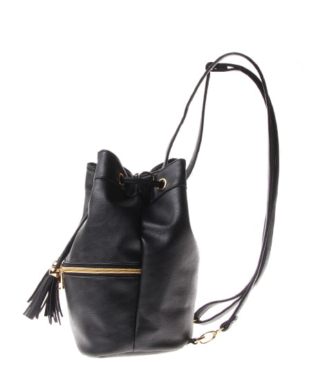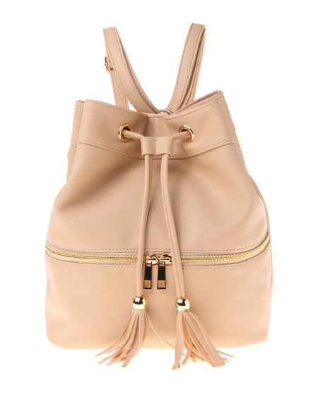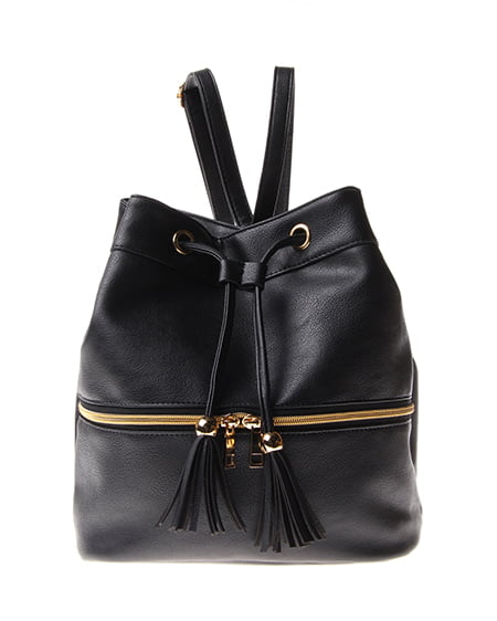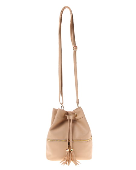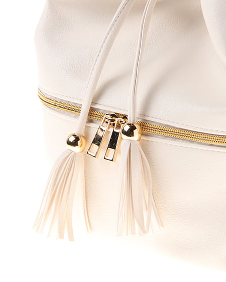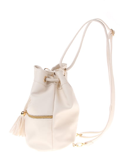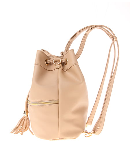 メタルフロントZIPが上品なリュック。ショルダーとしてもリュックとしても使えるベルトが便利。フロントに施された広めのZIPファスナーは、ポケットになっていて小物を入れられます。内ポケット付きで使い勝手も良く、収納力も抜群です。シンプルなリュックは、持つだけで品のあるコーディネートに仕上げてくれます。フリンジの紐で入口を結ぶ巾着タイプ。トレンドモチーフを組み合わせたリュックは、お出かけや通勤に持ち運びやすいサイズ感です。