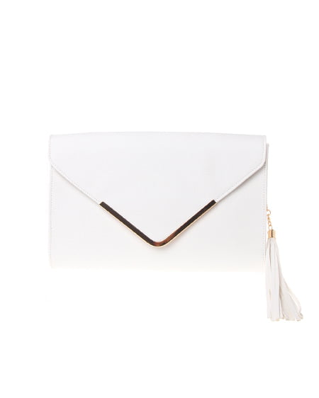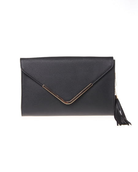 ショルダーバッグにもなるタッセルチャーム付きクラッチ。存在感のあるメタルパーツ付きの蓋がモダンな印象のBAG。ややマチもありウォレットやコンパクトなポーチなどを収納できる余裕のあるデザインが魅力。お揃いカラーのタッセルがトレンドを感じさせてくれオシャレなアクセントに。ショルダーベルトは5つのホールで長さ調整が可能です。丸みのあるマチが可愛らしいシルエットがクールレディなスタイリングにぴったり。