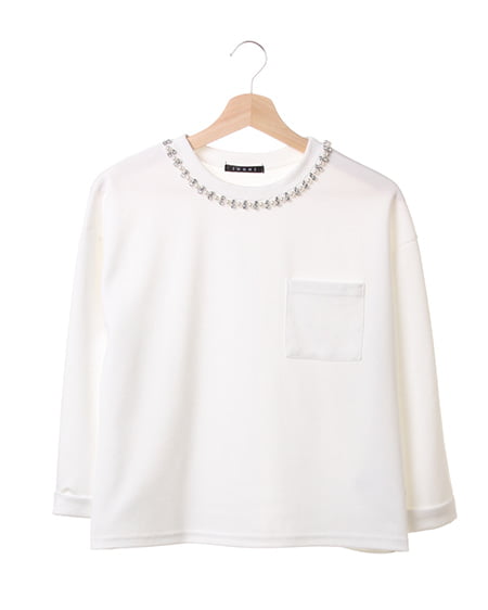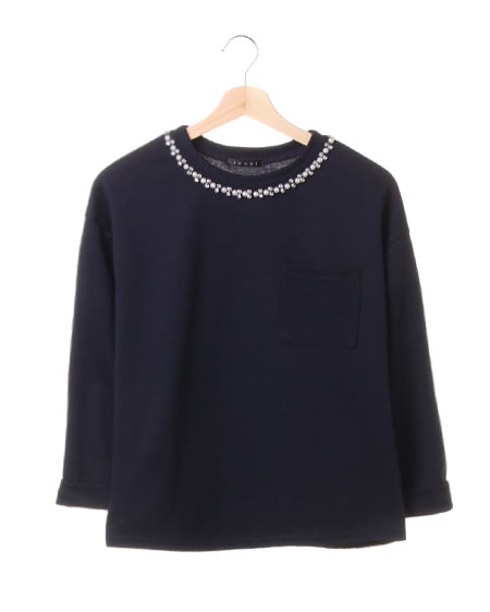 ナチュラルな雰囲気漂うゆったりトップス。シンプルな着こなしに大活躍してくれるトップスは、ビジュー装飾をプラスしたネックラインがフェミニンな仕上がり。ゆったりとした身頃に上品な首元のデザインがトレンドスタイルに仕上げるコツ。リラックスパンツやキュロットパンツでこなれ感を演出させてまとめて。