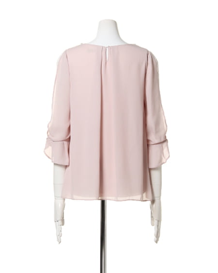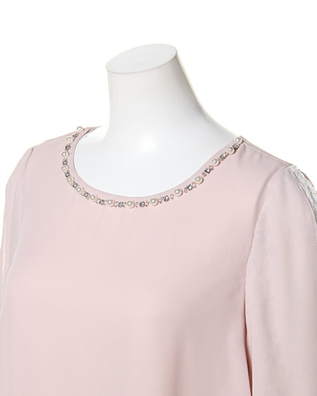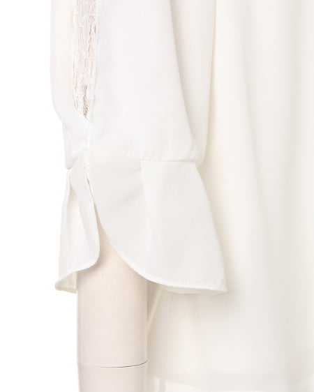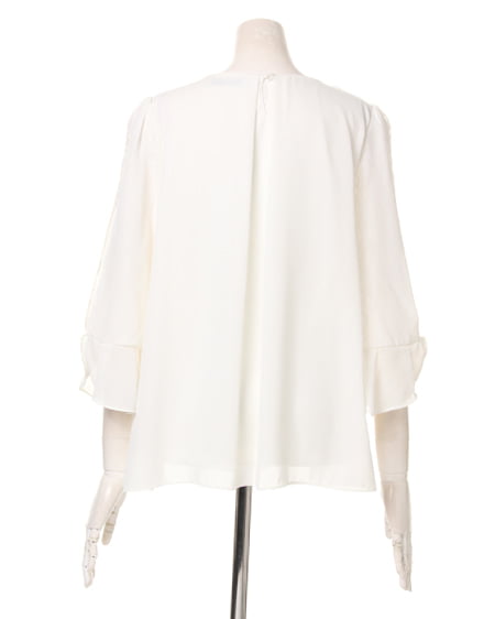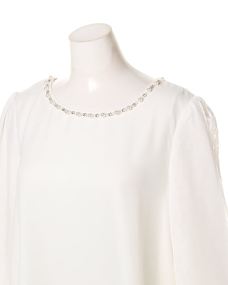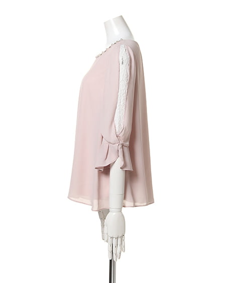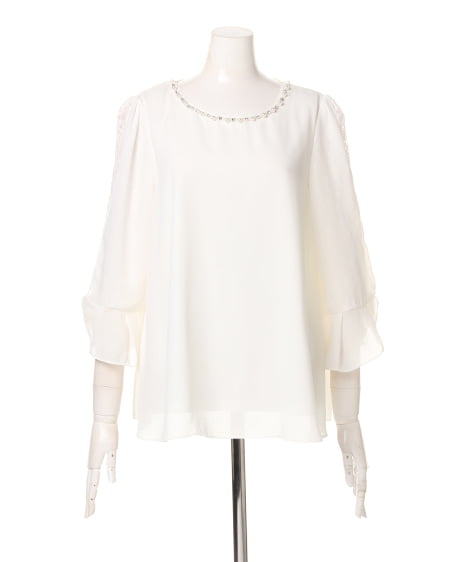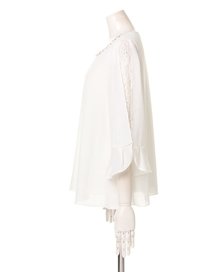 袖口の広がったベルスリーブが女性らしい印象のトップス。フワッと広がった袖口がさりげない動きとニュアンスを添え、華やかな印象を演出する洗練ディテール。袖部分に表情のある花柄レースをあしらったデザインで、レースの透け感が大人な雰囲気を与えます。裾にかけて緩やかに広がるシルエットで、体型カバーも叶うリラクシーな着心地の一枚。上品に開いたネックや、アクセサリー要らずのビジュー装飾でコーディネイトの主役になるアイテムです。