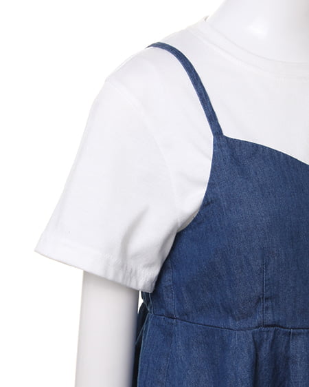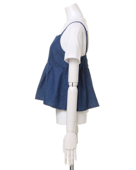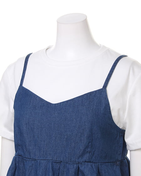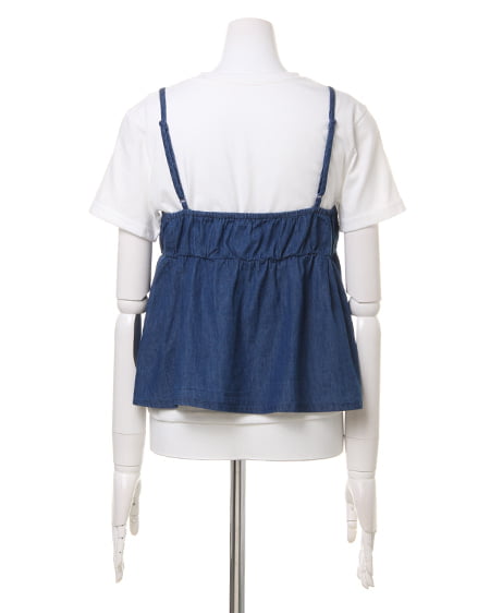 ペプラムキャミソールとTシャツがセットになったレイヤードアイテム。Tシャツはベーシックなホワイトカラーのクルーネックなので、着回し力抜群◎。合わせて着ることで、カジュアルな重ね着スタイルもグッと女性らしい印象に。セットで着るのはもちろん、それぞれ単品使いもでき、コーデの幅が広がるのもポイント。キャミのストラップは、サイズ調整ができるアジャスター付きです。