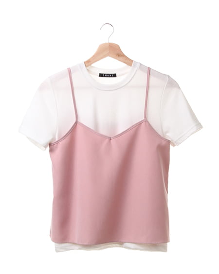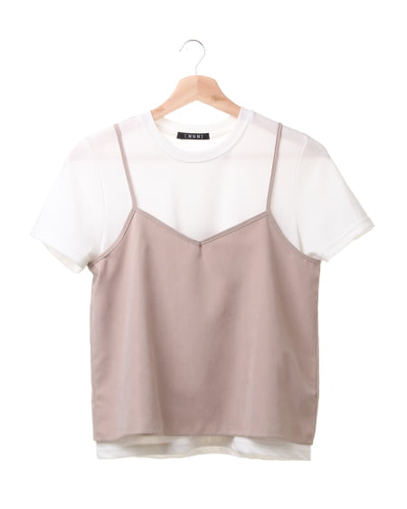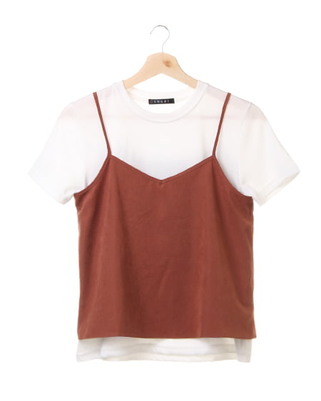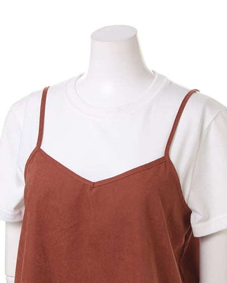 ピーチスキン素材のキャミとTシャツのセットアイテム。Tシャツはベーシックなホワイトカラーのクルーネックなので、着回し力抜群◎。合わせて着るだけで高感度抜群のレイヤードスタイルに。セットで着るのはもちろん、それぞれ単品使いもできコーデの幅が広がるのもポイントです。ボトムスはボリュームのあるガウチョやワイドパンツとのコーデがオススメ。キャミのストラップは、長さ調整ができるアジャスター付きです。