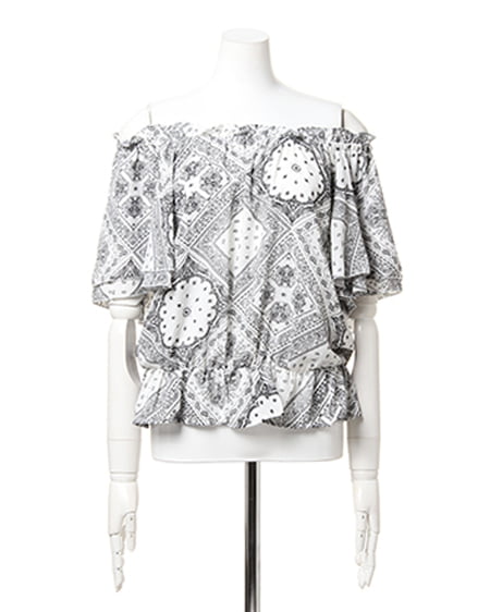 トレンド感抜群のバンダナ柄が目を惹くオフショルトップス。 ネックラインとウエストはゴム仕様になっており、肩を落としてオフショルとしてはもちろん、気分やコーデによってオフショルにせず、そのまま着ても◎。シフォン素材で柔らかく、ほどよく絞ったシャーリングのゴムがシルエットのバランスを引き立ててくれます。デザイン性がありながらもコーディネートに取り入れやすく、さらりと着るだけでオンナらしさもUP。ボトムスにはワイドパンツやガウチョパンツを合わせてトレンドスタイルを楽しむのはもちろん、サロペットなどのインナーにもオススメです。