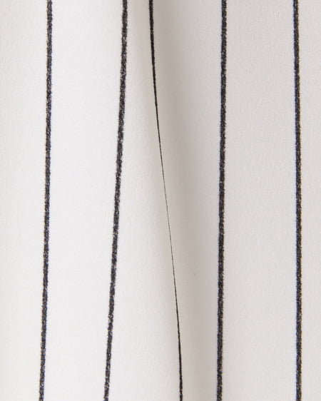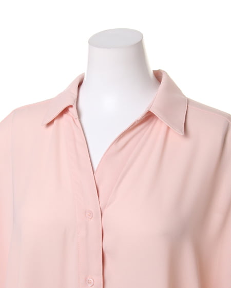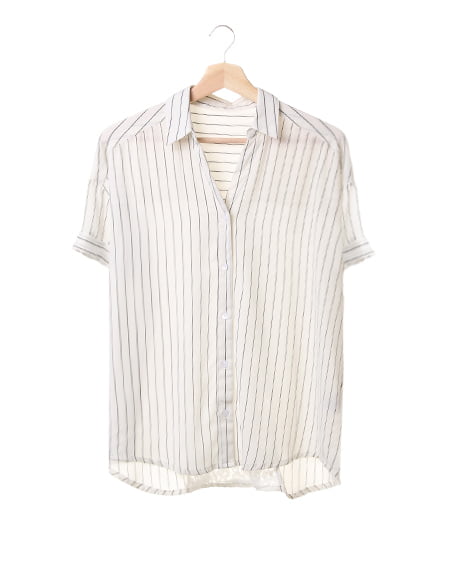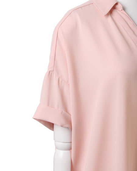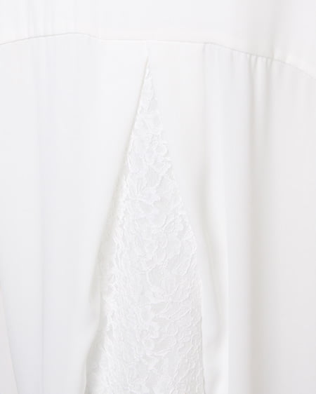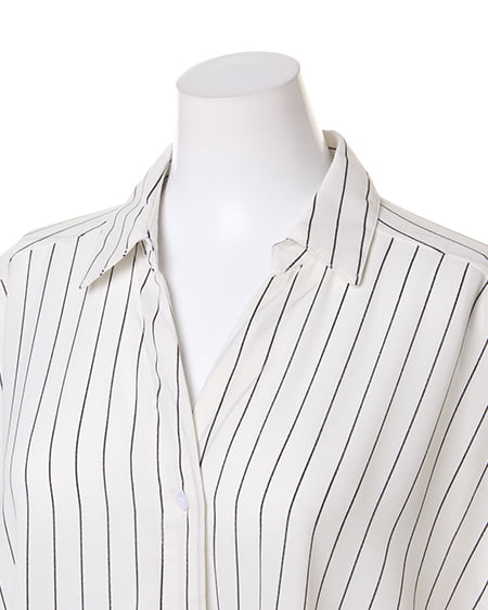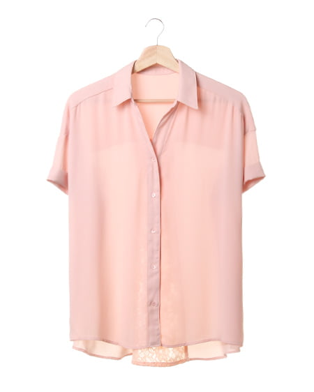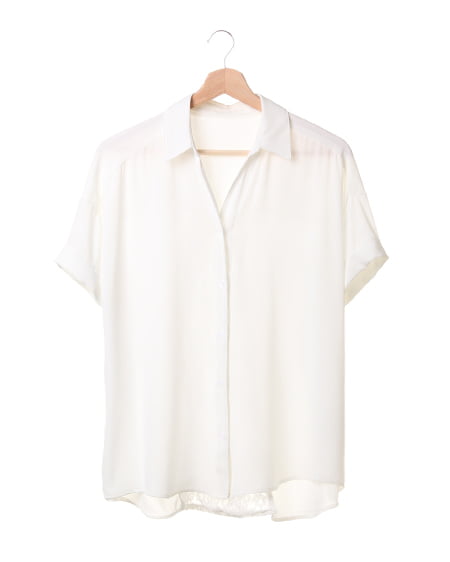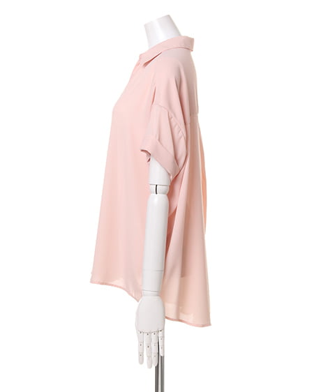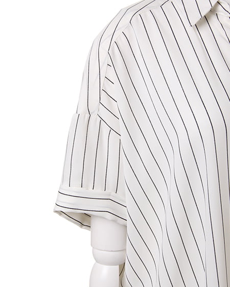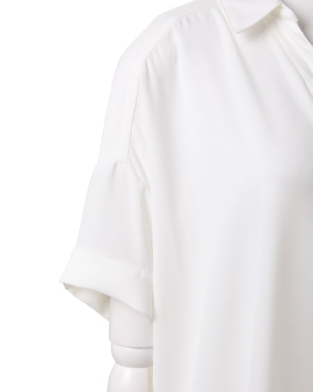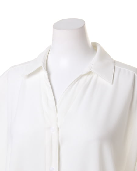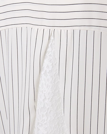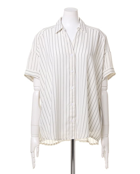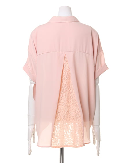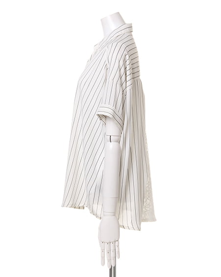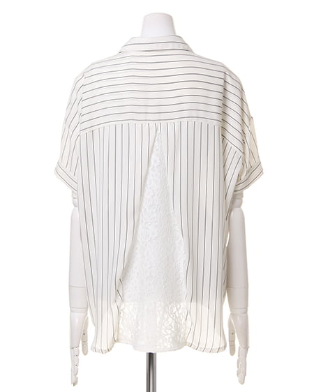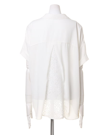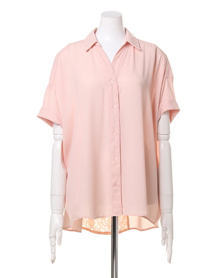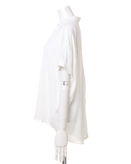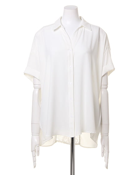 バックに施されたレースがポイントの半袖シャツ。うしろに抜ける衿のデザインや後ろ下がりのシルエットなど、今年らしいこだわりを詰め込んだ1着です。マストアイテムのビッグシルエットシャツは、体のラインを華奢にみせてくれる嬉しい効果も◎。一見シンプルなデザインながら、後ろからちらっと見えるレースがフェミニンな印象に。とろみのある生地感なので、きれいめにもカジュアルにもスタイリングが自由自在。今季はワイドパンツなどと合わせてボリューム感を出すのがオススメです。