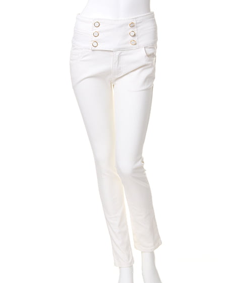 リッチな輝きがポイントの金縁ボタン付きハイウエストスキニーパンツ。人気のアクセントボタン付きスキニーは、太めのハイウエスト切り替えデザインがメリハリの効いた、くびれラインをマークしてくれます。ボディにぴったりとフィットするスキニーシルエットは、トレンドニットと合わせればクールな雰囲気で着られます。コンパクトにまとめたポケットは、お尻を小さく見せヒップアップ効果も期待。