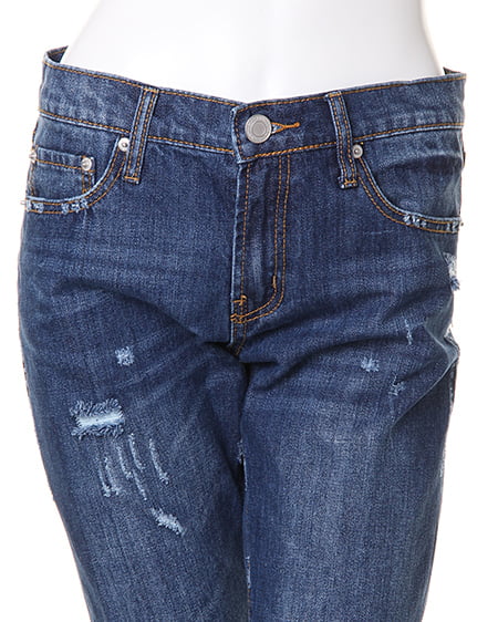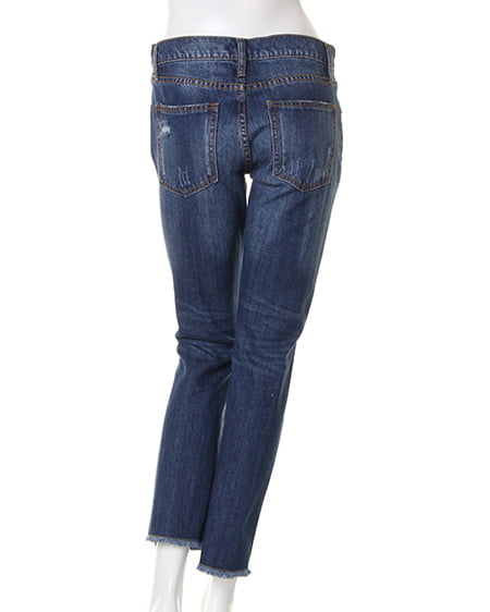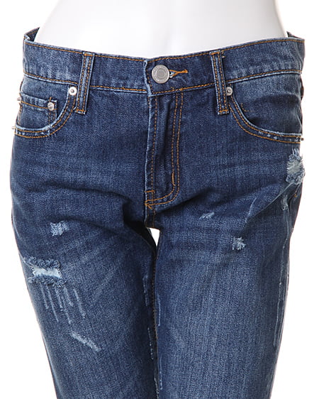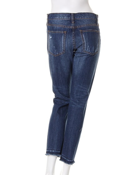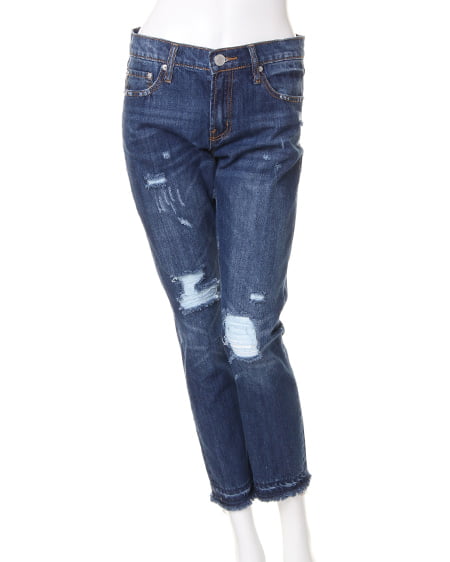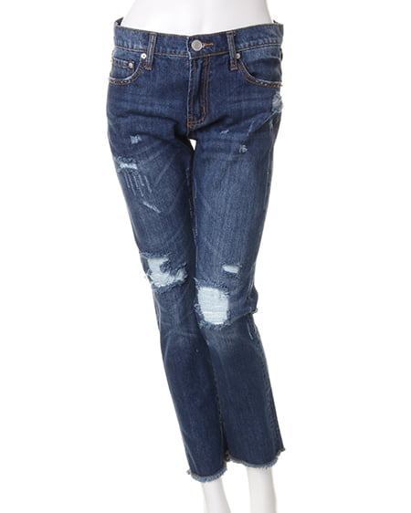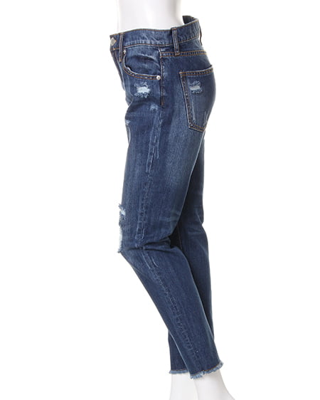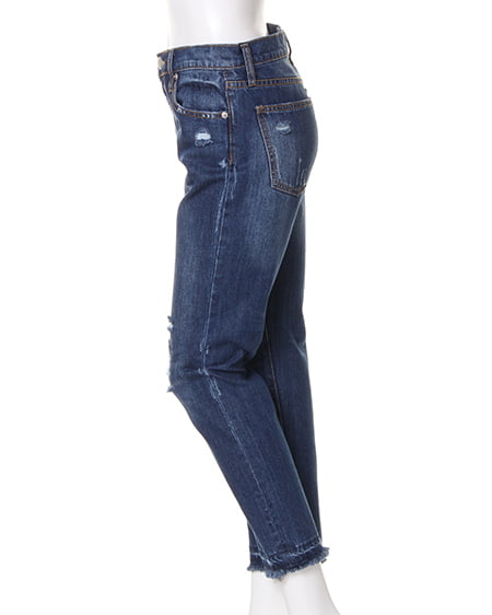 グランジテイストの素肌を覗かせるクラッシュテーパードデニム。裾に向かってシェイプされたシルエットのデニムパンツ。腿にゆとりがあるパンツは履き心地もラクでマニッシュなスタイリングにオススメ。やや大きめのクラッシュ加工から肌見せすれば、ちょっぴりセクシーさもプラスできてクールな女性を演出してくれます。スリムパンツやスキニーが苦手な方でもチャレンジしやすく、脚のラインをカバーしつつ美脚効果も期待できるアイテムです。