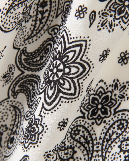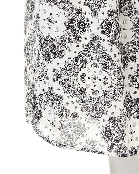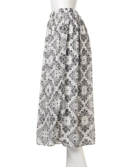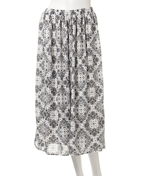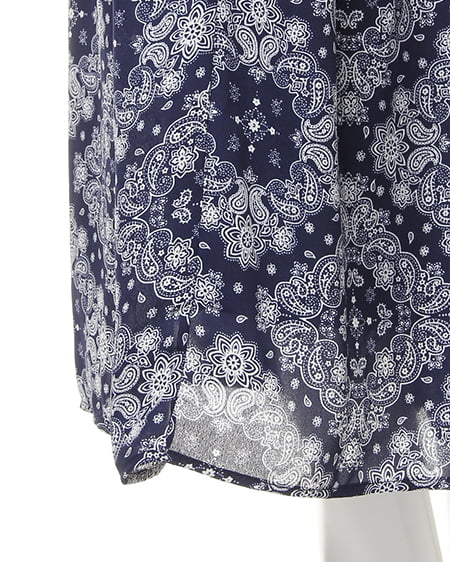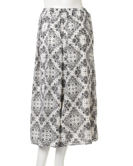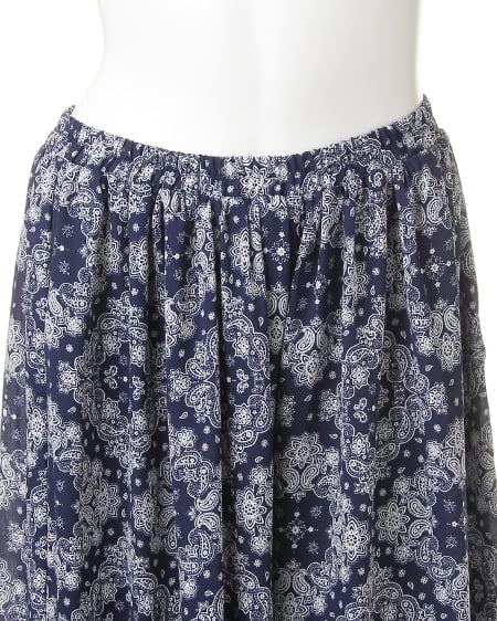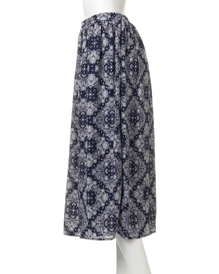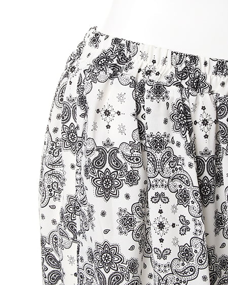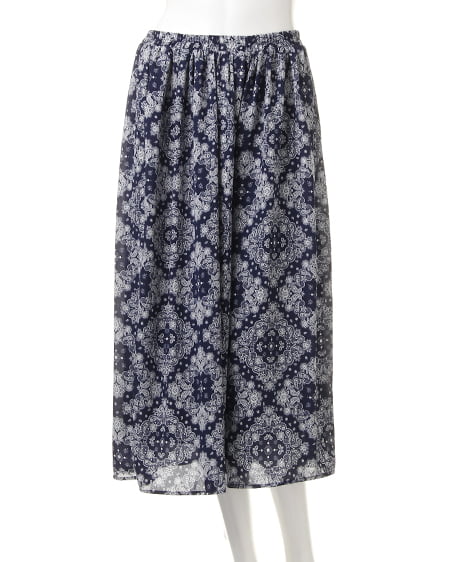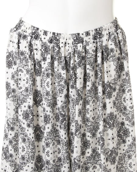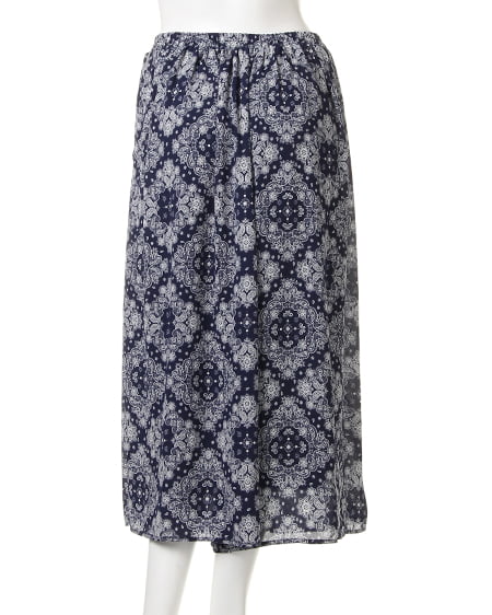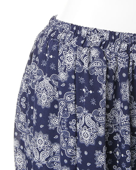 トレンドのバンダナ柄で仕上げた今年らしさ満点のスカンツ。透け感のある生地が涼しげなシーズンスタイルを叶え、一見するとロングスカートのようなルックスで女性らしく着こなせます。ウエストはゴム仕様で、股上も深めなので、ストレスフリーな履き心地も魅力。コンパクトなシルエットのトップスとのメリハリが利いたコーディネートがオススメです。