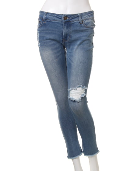 ダメージ加工を施した、クロップド丈のスキニーデニムパンツ。ヴィンテージライクな加工や裾のフリンジデザインがコーデにトレンド感をプラスしてくれます。ストレッチが効いているので、動きやすく穿きやすさも抜群◎。さりげない裾のフリンジが、スニーカーを合わせたカジュアルスタイルにはもちろん、キレイめな着こなしにも遊び心を演出してくれます。トップスを選ばないベーシックなデニムは、シーズンレスで活躍すること間違いなしの1本です。
