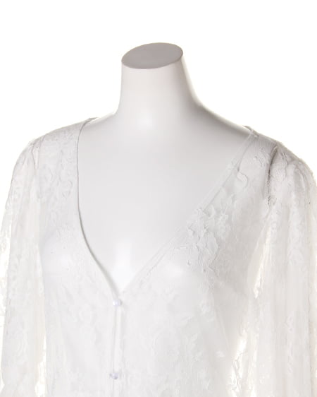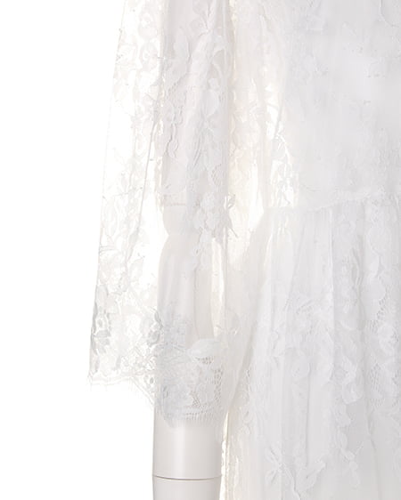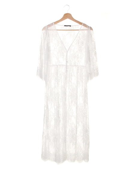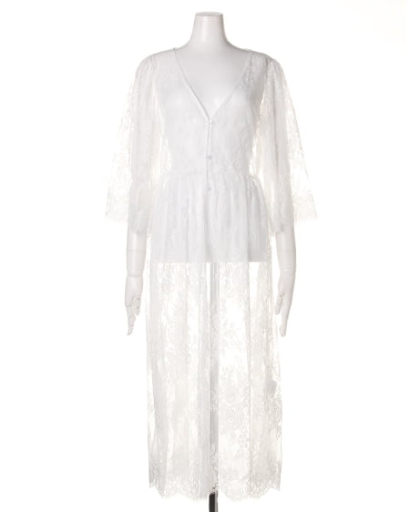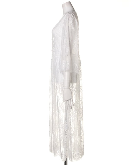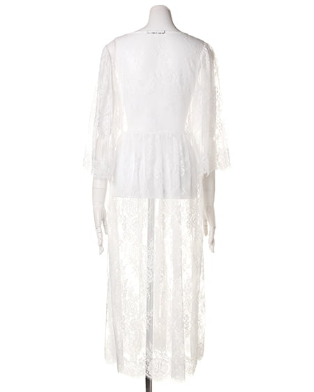 トレンド感溢れる繊細なレースを使用したロング丈のガウン。透け感のあるレース生地&7分袖デザインがシーズンライクな着こなしを演出してくれます。ウエスト部分で切り替えているので、ゆったりしたデザインも、すっきりとしたシルエットに。ふんわりしたワイドスリーブは、気になる二の腕をカバーしてくれる効果も◎。女の子らしいデザインなので、インナーはデニムやTシャツなどと合わせたカジュアルなスタイルがオススメです。いつものコーデにさらっと羽織るだけで、トレンドライクなスタイルが完成する1枚。