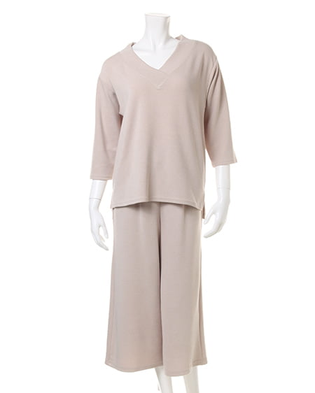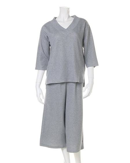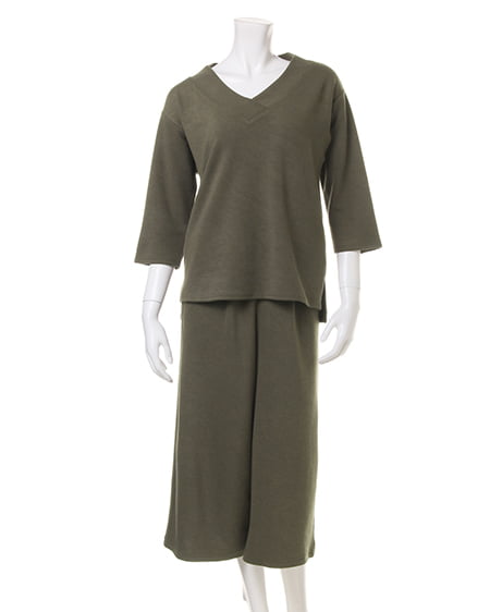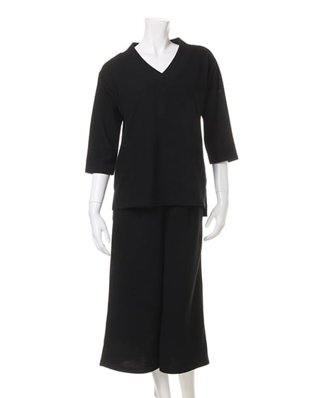 ミラノリブで仕上げたニットとガウチョのセットアイテムが7分丈の袖になって登場。肌触りのよい素材を使用したやや薄手のトップスとガウチョパンツのセットアイテムです。オシャレなVネックデザインが抜け感を演出してくれます。前後差のある裾がトレンドのフォルムを作り出してくれ、セットのパンツとのメリハリを付けてくれます。パンツのウエストは、ラクチンなゴム仕様のリラックスした着心地が魅力のアイテムです。