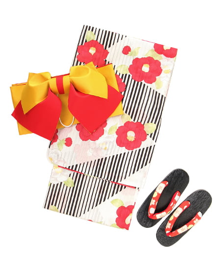 今期トレンドのモダンレトロが叶う椿柄の浴衣。夏の大定番、浴衣と帯+下駄の3点セットアイテムです。全体に鮮やかな椿をあしらい、さりげないストライプ柄が女性らしい上品な印象に。簡単に着付け可能な造り帯は、つけるだけでワンランク上のボリューム感ある帯結びで後ろ姿にも差をつけてオシャレ度がアップ◎。サラッとした肌触りで、着心地も抜群です。お気に入りのアクセや巾着かごバッグなどとコーデすることで、より自分らしい浴衣スタイルに。お祭りや花火大会など夏のイベントには欠かせないファッションアイテムです。