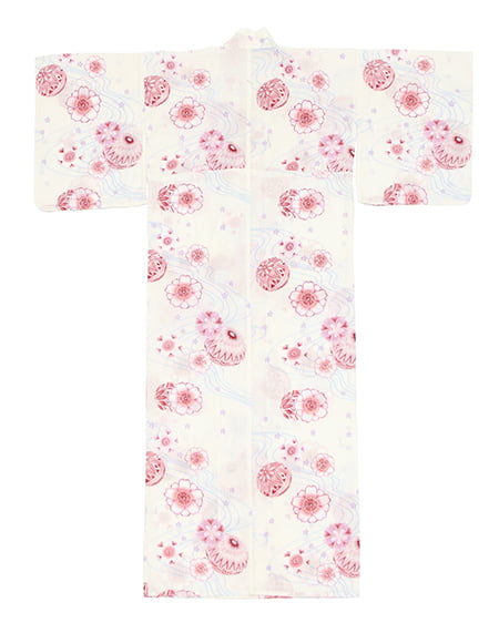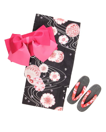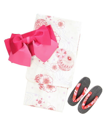 ちょっぴりレトロで、可愛らしい雰囲気を演出してくれる毬柄の浴衣。夏の大定番、浴衣と帯+下駄の3点セットアイテムです。全体に毬と桜の柄をあしらい、流水紋で甘くなりすぎず落ち着いた女性らしい印象に。簡単に着付け可能な造り帯は、つけるだけでワンランク上のボリューム感ある帯結びで後ろ姿にも差をつけてオシャレ度がアップ◎。サラッとした肌触りで、着心地も抜群です。お気に入りのアクセや巾着かごバッグなどとコーデすることで、より自分らしい浴衣スタイルに。お祭りや花火大会など夏のイベントには欠かせないファッションアイテムです。