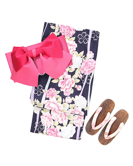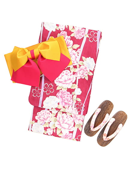 色鮮やかな牡丹柄が目を惹く浴衣。夏の大定番、浴衣と帯+下駄の3点セットアイテムです。全体に施された牡丹柄が女性らしい華やかな印象に。簡単に着付け可能な造り帯は、つけるだけでワンランク上のボリューム感ある帯結びで後ろ姿にも差をつけてオシャレ度アップ◎。サラッとした肌触りで、着心地も抜群です。お気に入りのアクセや巾着かごバッグなどとコーデすることで、より自分らしい浴衣スタイルに。お祭りや花火大会など夏のイベントには欠かせないファッションアイテムです。