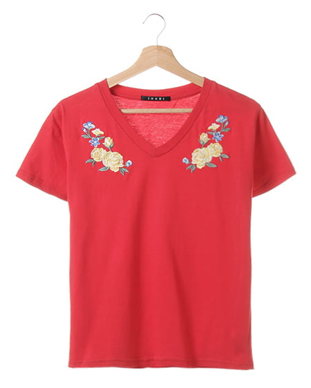 胸元に色鮮やかな花柄刺繍をあしらったVネックTシャツ。すっきりとしたVネックにドロップショルダーのゆったりしたシルエットが女性らしいラインを演出してくれます。柔らかな肌触りで着心地も抜群。今季トレンドの刺繍アイテムは、1枚持っているだけでこなれ感が出る主役級のアイテムです。スカートやスキニー、ワイドパンツともコーディネートしやすく、どんなボトムとも好バランスにマッチ◎。いつものコーディネートにプラスするだけで、旬なスタイルが完成するオススメのアイテムです。