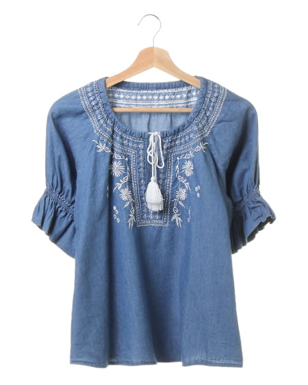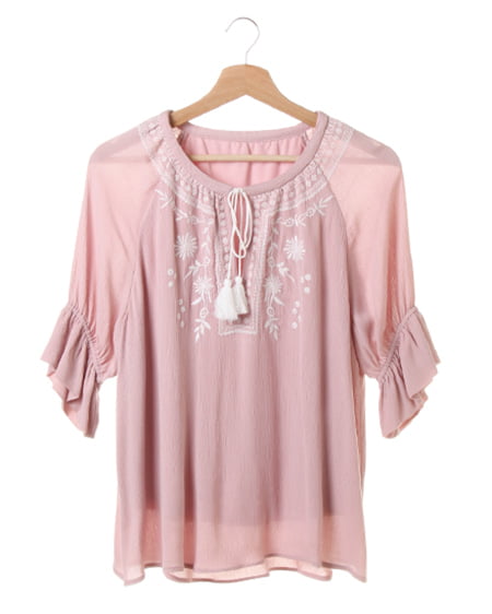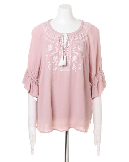 サラリとした楊柳レーヨンで仕上げた刺繍トップス。動くたびに優しく揺れるシルエットが女性らしさをアピールしてくれます。胸元の刺繍とフロントにあしらったゆらりと揺れるタッセルがコーデのアクセントに。季節感溢れる、楊柳の素材がこれからの時期に最適です。前後差のついたシルエットがうまく腰回りをカバー◎。デニムと合わせたカジュアルなスタイルから、テーパードパンツと合わせたきれいめスタイルにまで、幅広く活躍してくれるアイテムです。