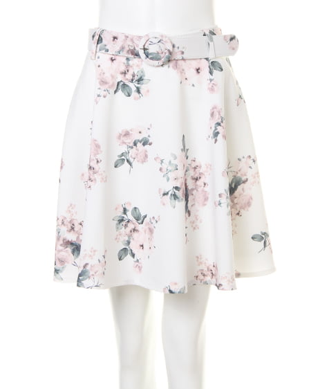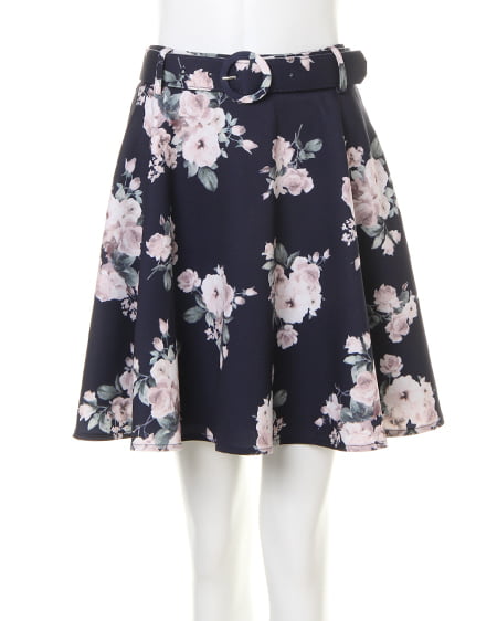 ヴィンテージ調のフラワープリントをのせたベルト付きフレアスカート。歩くと揺れるシルエットが、女性らしい上品なスタイリングを演出します。バックウエストはゴム仕様なので楽な穿き心地ながら、フロントはスッキリと仕上げきちんと感をキープ。共布のベルトでウエストマークをすれば、メリハリの利いたスタイルが完成します。セットのベルトは今年らしいサークルモチーフ付きでトレンド感をアピール。全体的にボリューミーなシルエットなので、コンパクトなトップスやトップスINしたメリハリのある着こなしがオススメです。