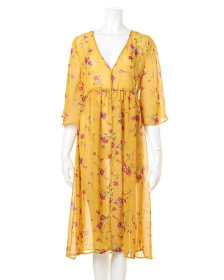 可憐なフラワー柄を乗せたガウン。軽やかなシフォンの生地感がシーズンムード漂い、フロントボタンを閉じてワンピース風にもアレンジが楽しめる旬なアイテムです。胸下の切り替しのギャザーから、ふわっと広がる裾にVネックにフレアになった袖が華やかな印象にしてくれます。長めの着丈でさりげなくスタイルアップ効果も◎。デニムに合わせてきれいめカジュアルにはもちろん、ワイドパンツにあわせラフなスタイリングもオススメ◎。いつものコーデにさらっと羽織るだけで、トレンドライクなスタイルが完成する1枚です。