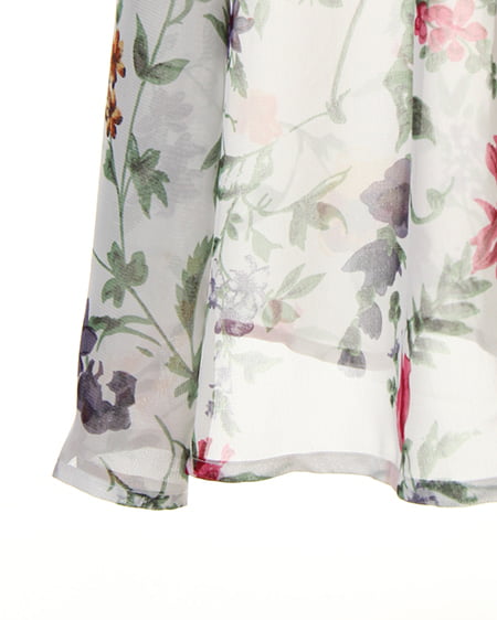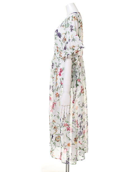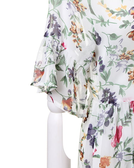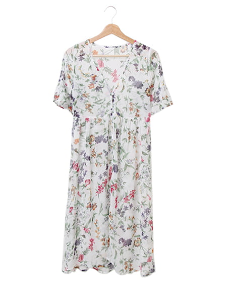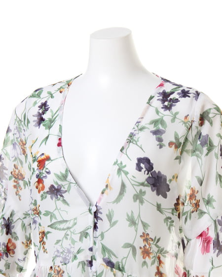 色鮮やかな花柄が目を惹くガウン。軽やかなシフォンの生地感がシーズンムード漂い、フロントボタンを閉じてワンピース風にもアレンジが楽しめる旬なアイテム。胸下の切り替しのギャザーから、ふわっと広がる裾にVネックにフレアになった袖が華やかな印象にしてくれます。長めの着丈でさりげなくスタイルアップ効果も◎。デニムに合わせてきれいめカジュアルにはもちろん、ワイドパンツにあわせラフなスタイリングもオススメです。いつものコーデにさらっと羽織るだけで、トレンドライクなスタイルが完成する1枚。